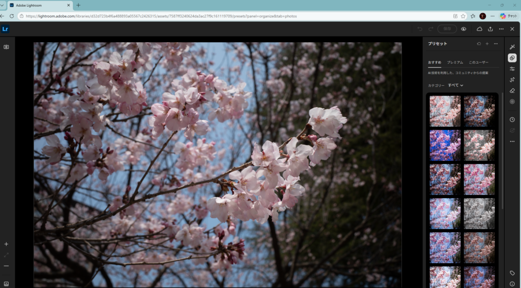 そのあとに Web 版 Lightroom を起動すしてから、右上のプリセットボタンを押すと、AIが画像を解析した後に、おすすめ候補のプリセットで処理した画像のサムネイル一覧が表示されました.